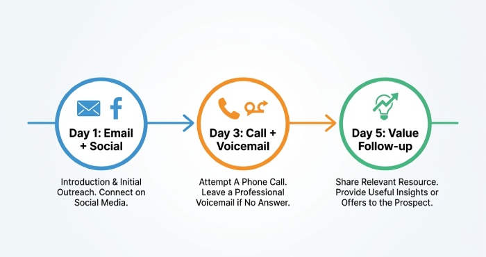 - Day 1: Email 1 + LinkedIn view + cold calling attempt with voicemail.
