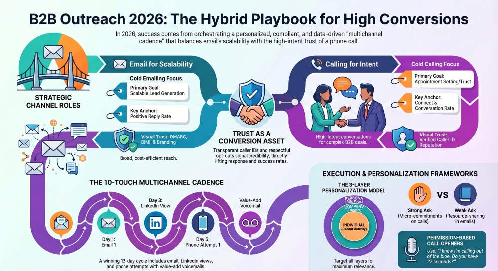 Success in 2026 depends on using the right channel at the right stageāsupported by strong personalization, clear messaging, and data-driven measurement. Ultimately, organizations that integrate both methods into a structured sales cadence, backed by modern tools, AI, and compliance best practices, will generate stronger pipelines and achieve better ROI.