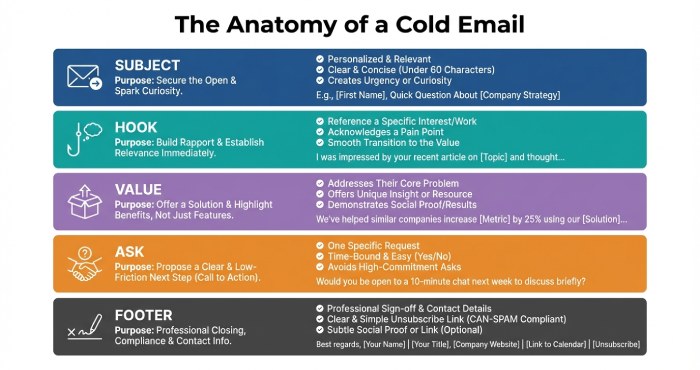 - Keep cold emails concise; link your portfolio and resume, and include clear contact information.