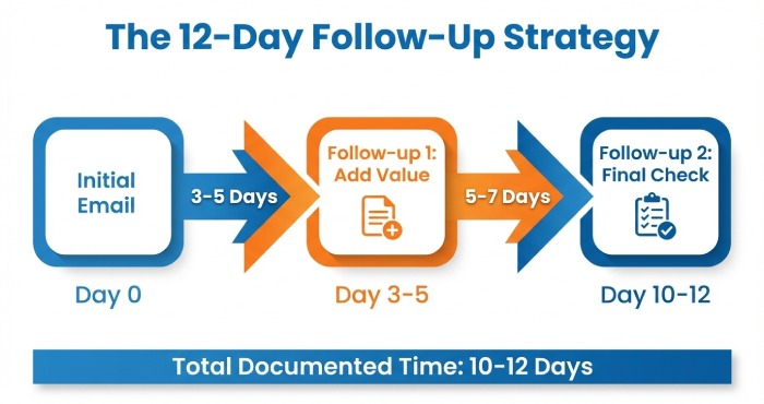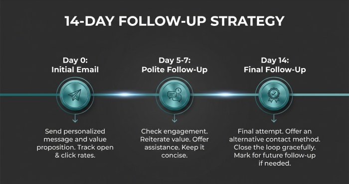 - Use a respectful follow-up cadence and mix channels with email plus LinkedIn direct message.