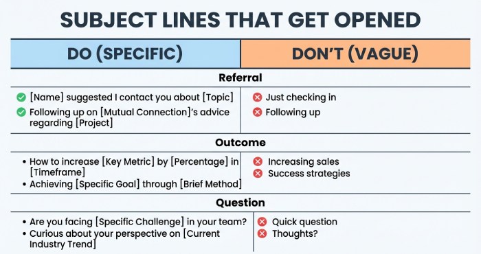- Do keep it concise (6–9 words) and informative to increase reply rate.