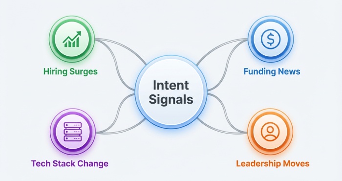 - Angle: Time-sensitive signals (funding, hiring spikes, new leadership).