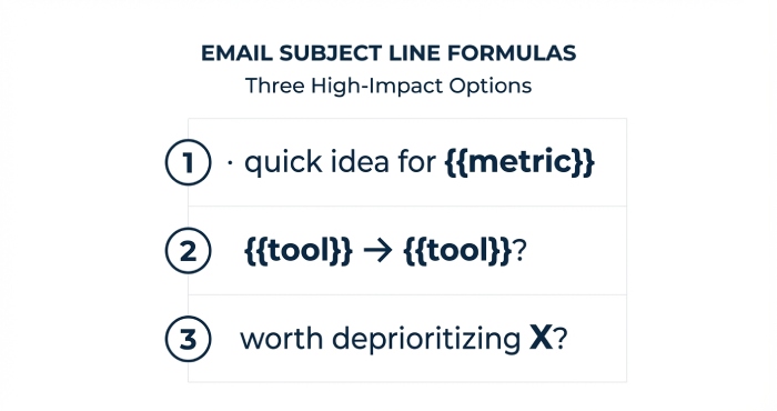- Email opener: âNoticed {{tool}} + {{pricing_tier}}âteams like {{peer_logo}} trimmed 28% cost with us.â