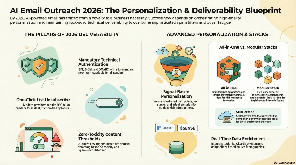 • Authentication (SPF, DKIM, DMARC) plus one-click unsubscribe is non-negotiable for deliverability in 2026.
