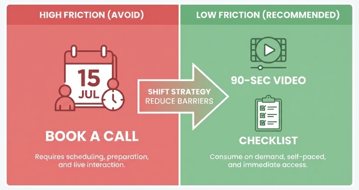 Value-first offers: micro-yes CTAs, content assets, and low-friction next steps