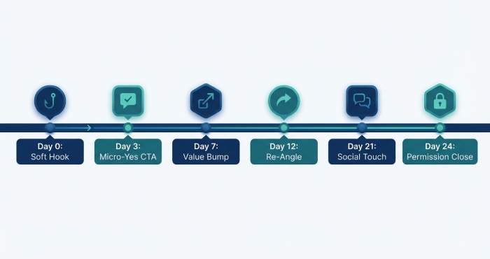 Design 4–7 touch sequences over 14–28 days. For linkedin outreach, a proven cadence is:
