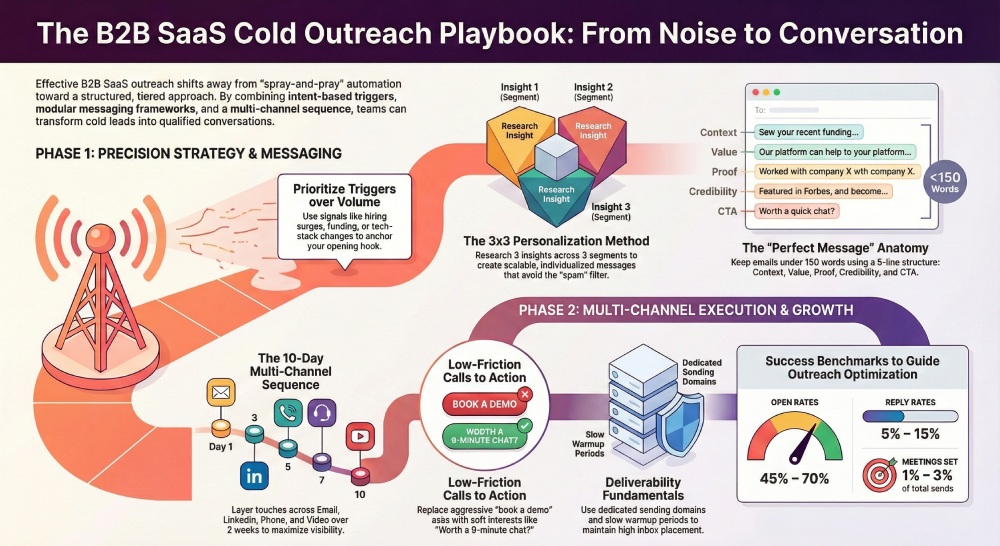 Cold outreach techniques for B2B SaaS work best when built on a clear ICP, tight segmentation, and structured playbooks that prioritize relevance over volume. Start with proven frameworks like AIDA (Attention, Interest, Desire, Action) for awareness-stage prospects, PAS (Problem, Agitate, Solution) for pain-aware buyers, and the 3×3 method (3 insights across 3 segments) for scalable personalization. Your opening line should reference a trigger—recent funding, hiring trends, tech stack changes, or a LinkedIn post—then quickly connect it to a measurable outcome your SaaS delivers (revenue lift, cost savings, time reduction, or risk mitigation).