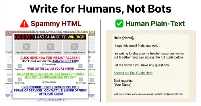 Use plain-text or light HTML, minimize links and images, and avoid trigger words that push mail to the spam folder. Make messages relevant to the recipient and tailor follow-up emails with fresh value.