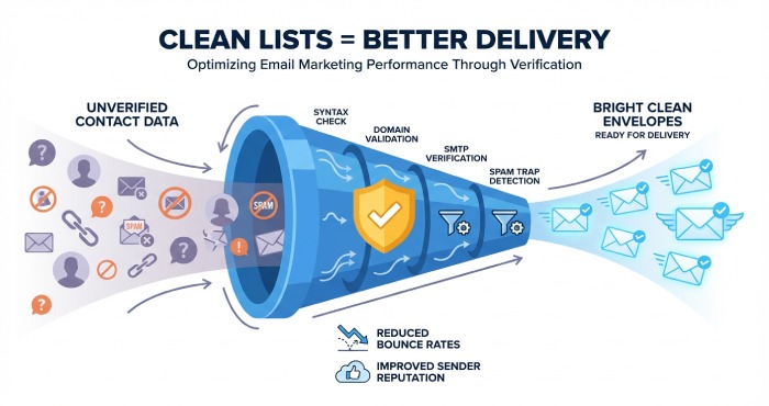 Apply email list verification and email address verification to every lead list. Never buy email list data; instead, source opt-in or high-intent contacts to protect inbox deliverability and email reputation.