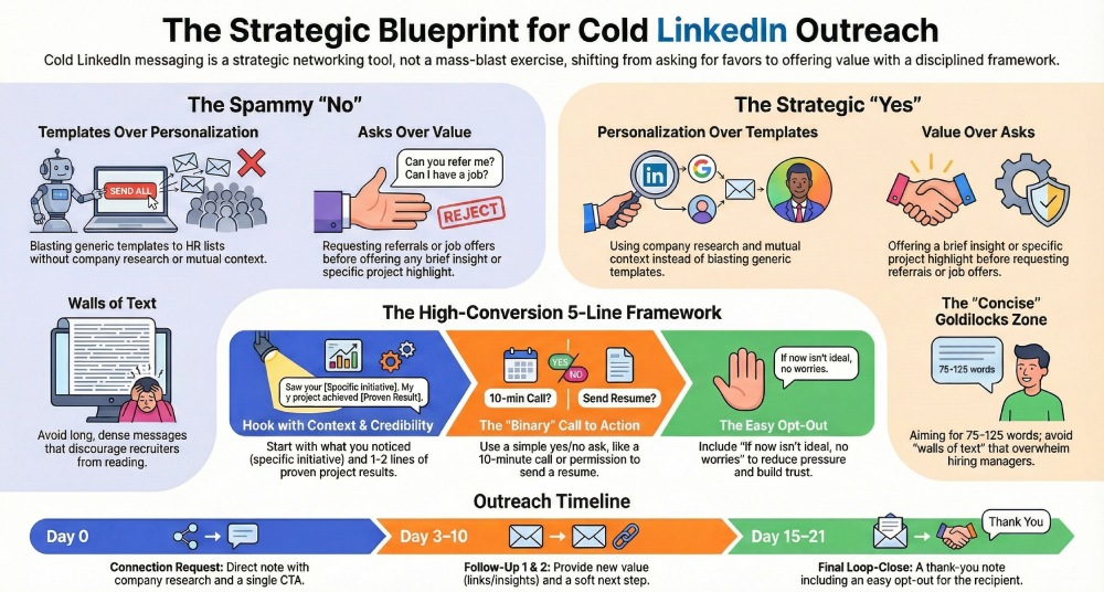 It highlights when cold messaging is appropriate, how to prepare your profile and proof points, and how to structure concise, human messages with clear calls to action. By combining relevance, timing, and respectful follow-up etiquette, professionals and students alike can transform cold outreach into meaningful conversations that build credibility and long-term career opportunities.