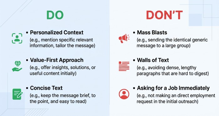 - Don’t ask immediately for job offers, full-time offers, or a referral request. Earn it first with relevance and a small value add.